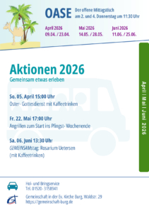 - Wir sind eine kleine Gruppe von Christen an 3 Orten, die sich gern mit der Bibel beschäftigt und Gemeinschaft lebt: 2 x im Monat gibt es donnerstags unsere OASE- den offenen Mittagstisch. Im Winterhalbjahr haben wir gemütliche Kaminabende, im Sommer ist x im Monat GEMEINSAMstag, wo wir etwas miteinander unternehmen (Grillen, Minigolf, Museums- Besuche, Kaffeetrinken, Spiele,…).