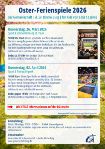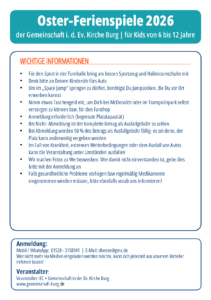 - Für Kinder bieten Kinder- Ferienspiele an. Dort besichtigen wir Fußballstadien, besuchen Winnetou & Old Shatterhand in Bad Segeberg oder toben uns bei Spiel & Sport in der Turnhalle aus. Teenager (ab 12 J.) kommen am 1. & 3. Donnerstag im Monat auf ihre Kosten- bei chilliger Musik, Chips, Cola und spannenden Aktionen.